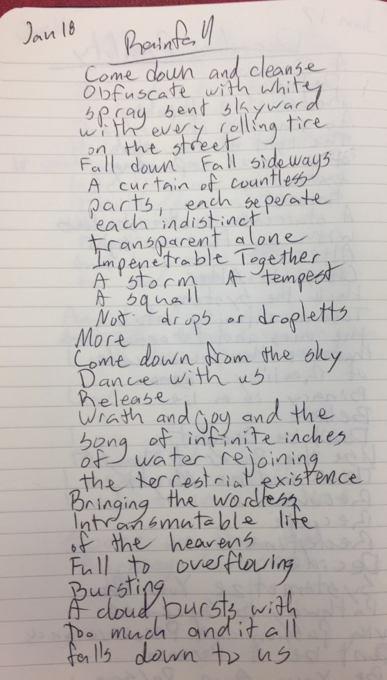 I love the rain. Even when it makes me change my plans like it did this morning. There’s something about it that’s inspiring and comforting yet powerful with potential. It demands welcome and respect. And that’s enough out of me. On to today’s poetry!