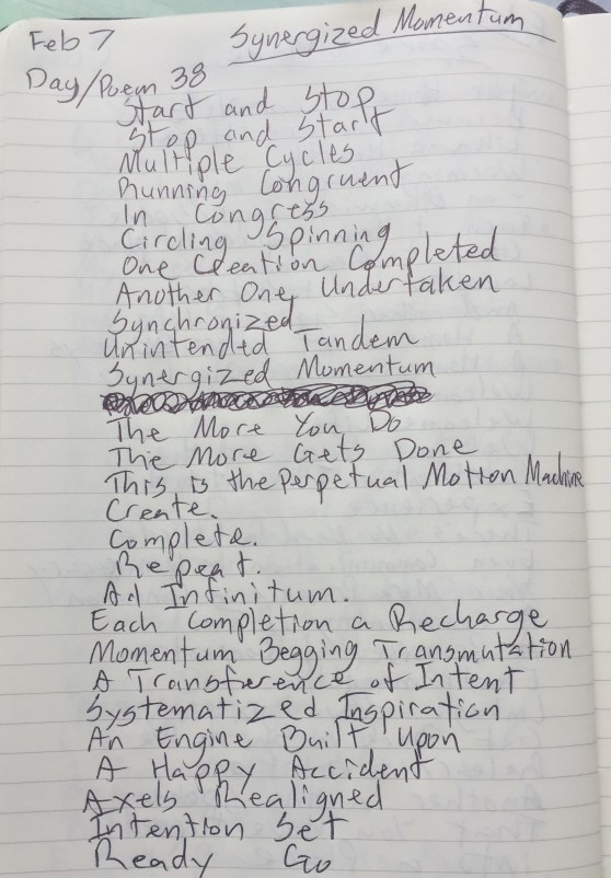 My bride is home–cannot tell you enough how ecstatic that makes me. She’s definitely my touchstone. While she was away, I slipped from my routine and things I meant to get done quickly ended up takin much longer. Today, waking up with her, I was able to leap right back into things and completed a major milestone with one project and took the first major step in another, unrelated project. The momentum of completing the one fed into the other, which is the inspiration for today’s poem.