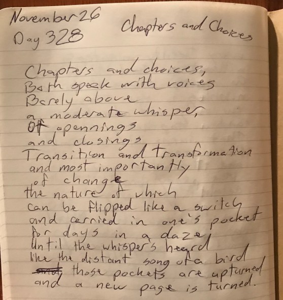 Feeling rhyming and whimsical this morning. Also, I’m going to need another notebook for my poems. I thought this new one would last me until the end of the year. There’s always something fun about filling in that last page though.