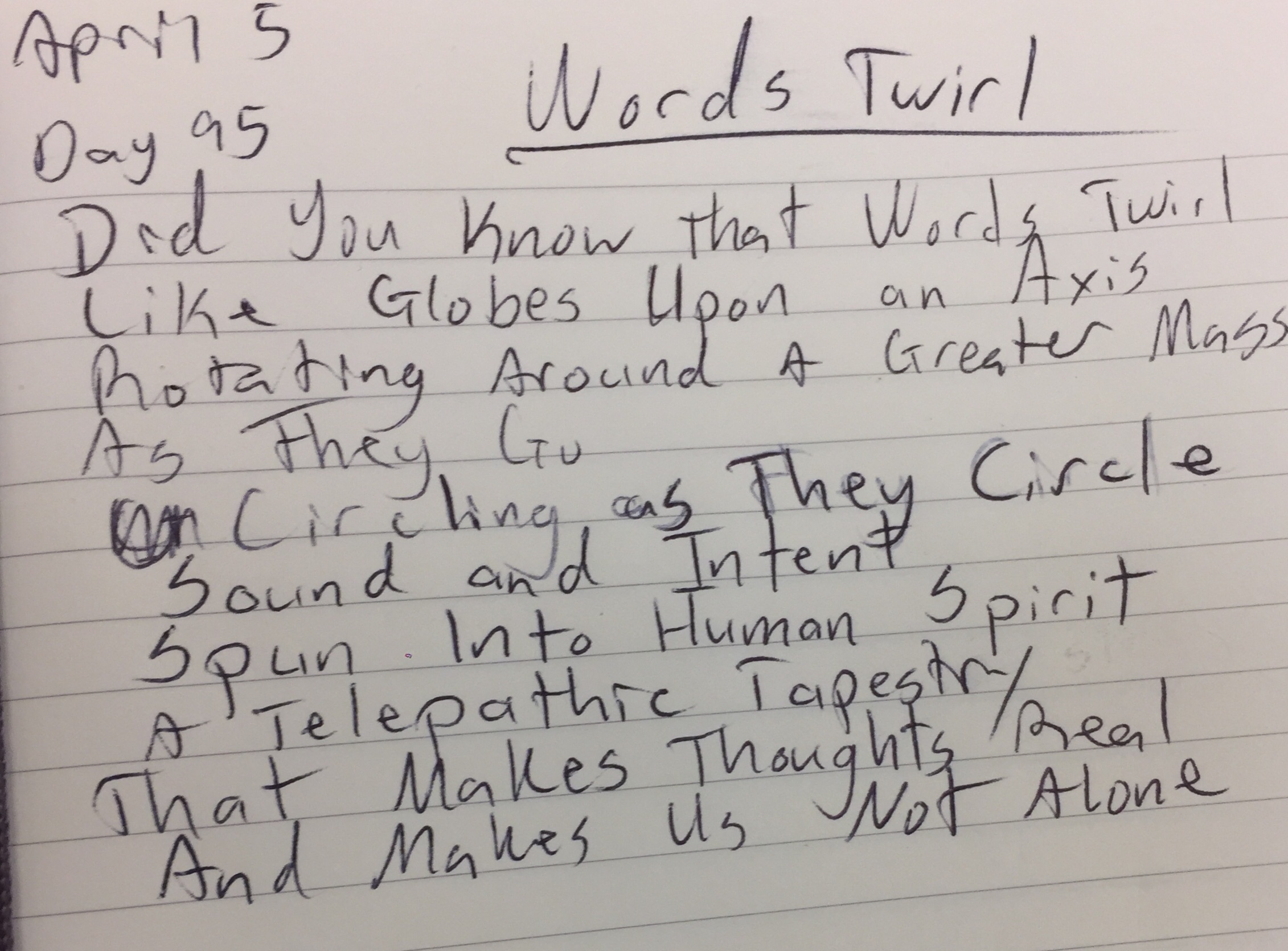 Realized this morning that I’ve once again got my days mislabeled in my poetry journal, and by extension, this blog. Dang it. Corrected them in the journal but I’m going to have to set aside some time to fix things online in the near future. At least today’s number is right…I hope.