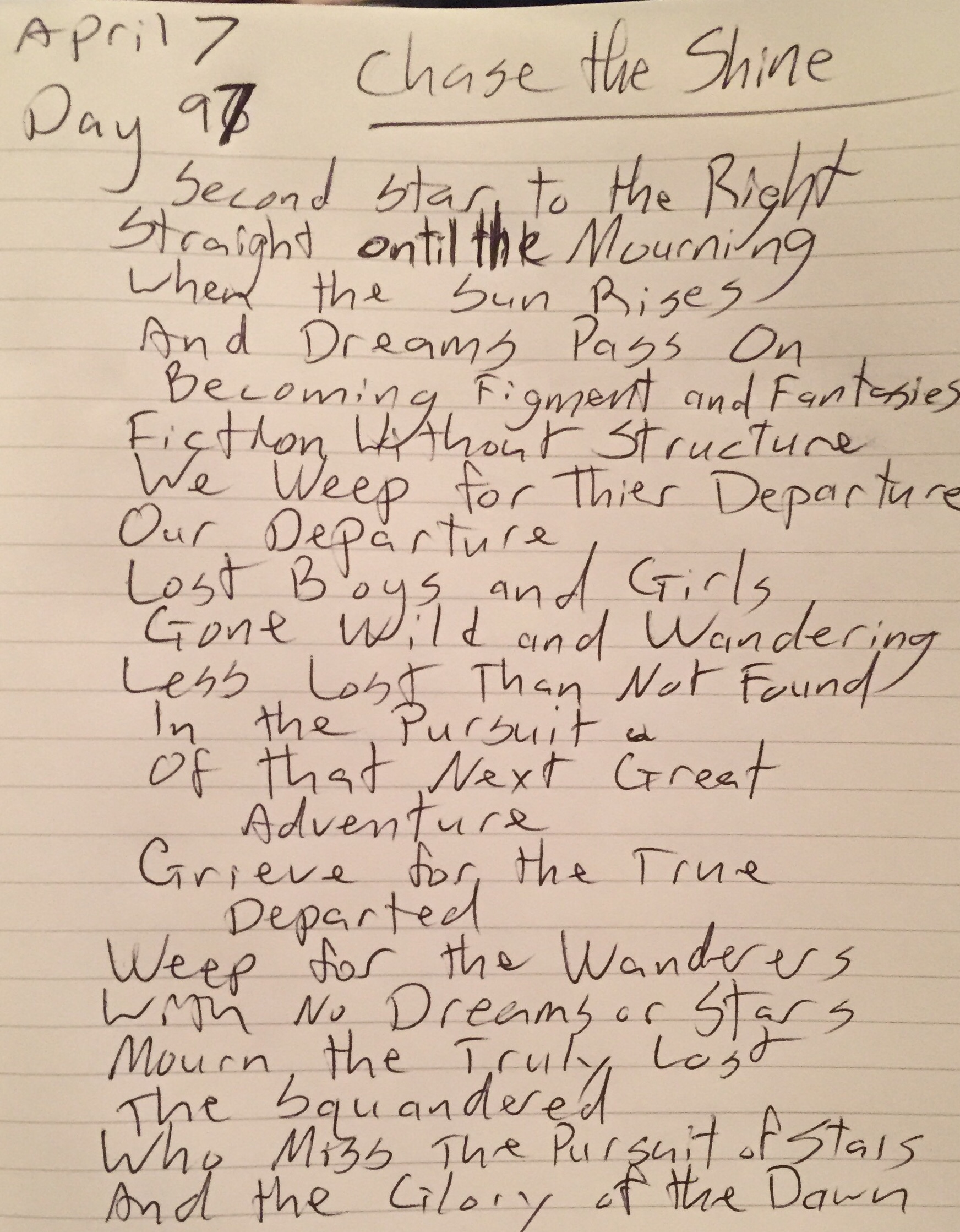 Today’s poem is inspired by missing yesterday’s. I couldn’t tell you why Neverland and Peter Pan popped into my head, exactly, though in this context it certainly makes sense. Those stories are really depressing and downright frightening at their heart. Missed and stolen opportunities.