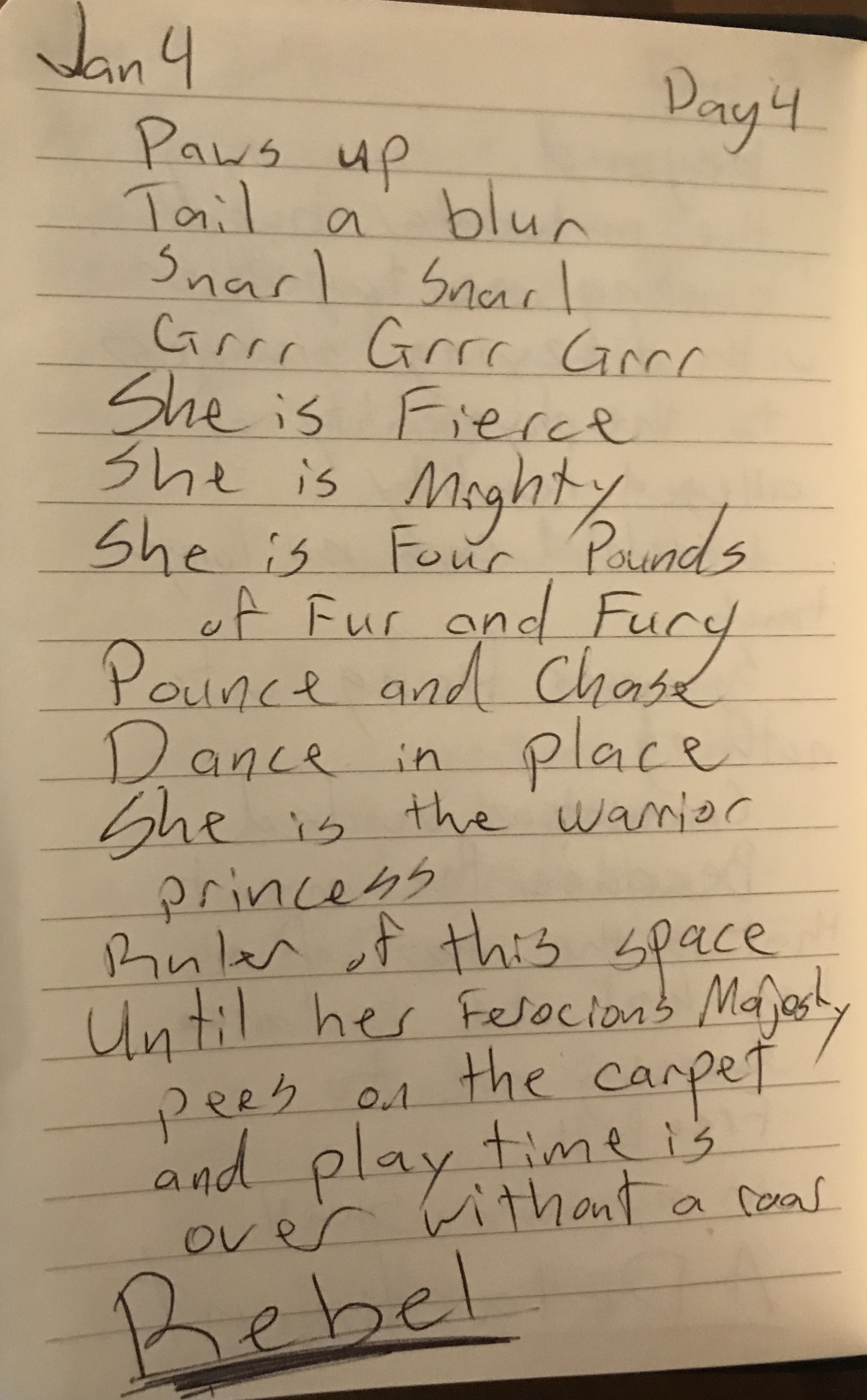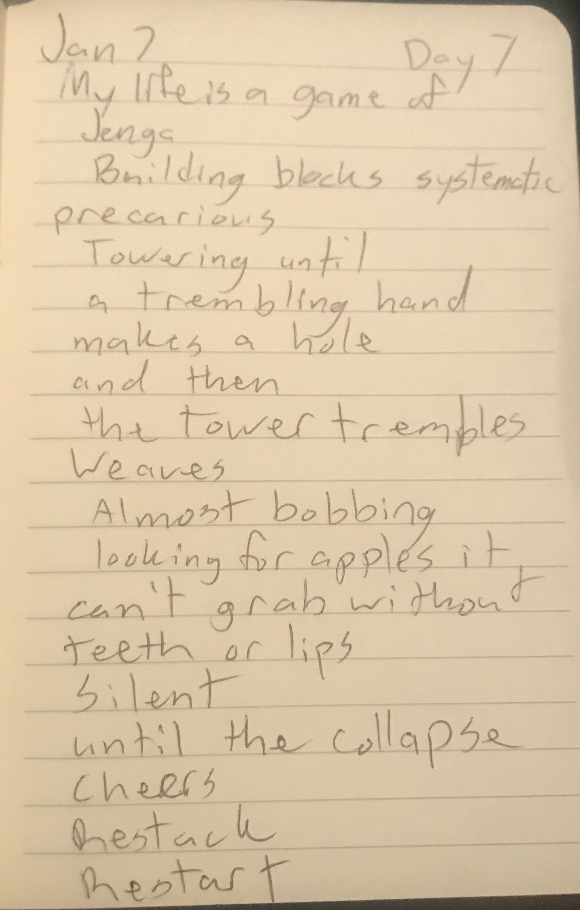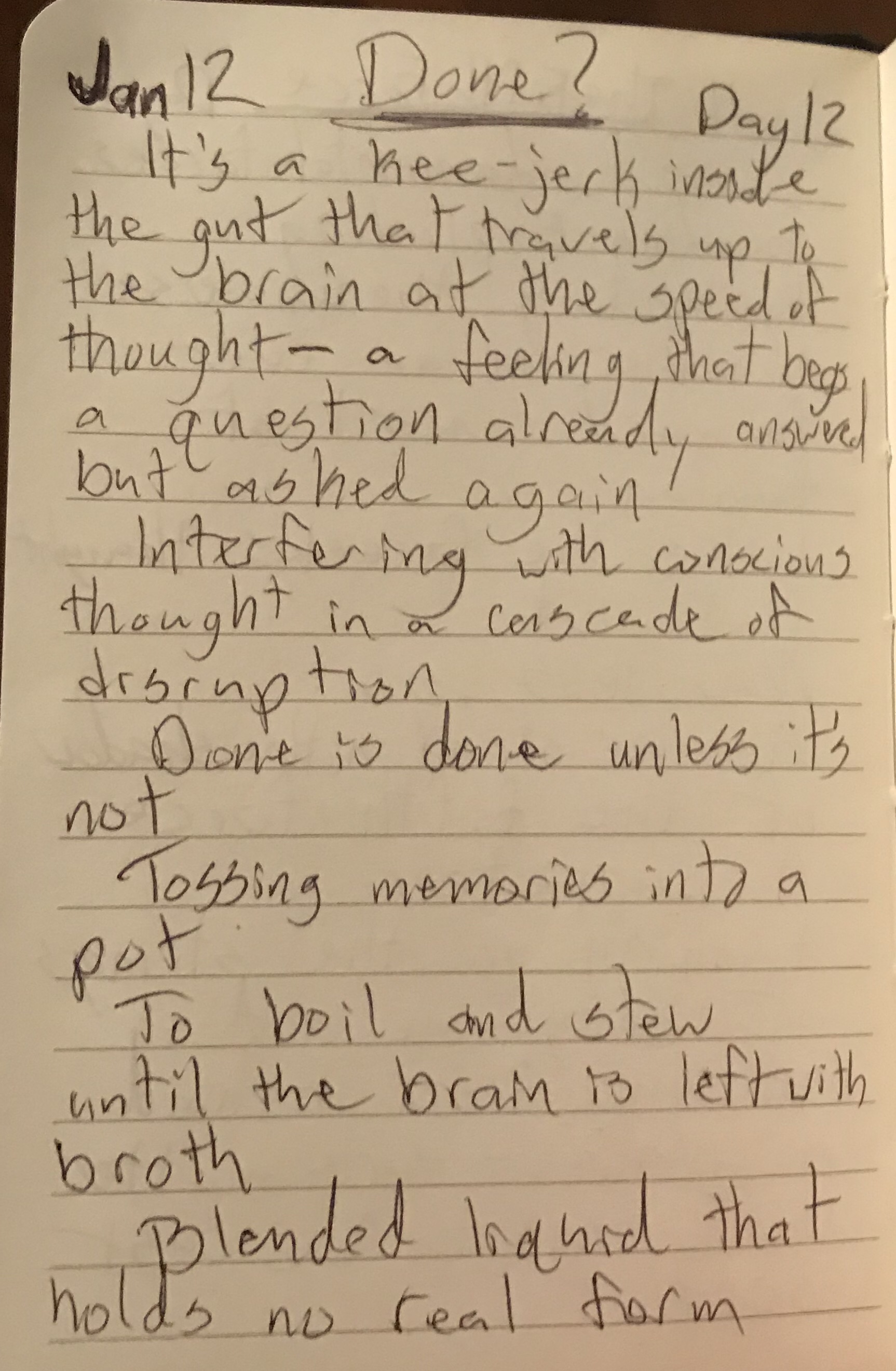 Nope, I didn’t forget today’s poem. I woke up this morning, sat in my chair with my notebook and a mug of coffee…and nothing. This doesn’t happen to me. I don’t get blocked! But I did. In large part this was because I couldn’t select my subject matter. Three guesses what I finally settled on. Funny how just picking something and giving yourself permission to suck, just so long as you move forward works. Or at least that’s been my repeated experience. Anyone else?