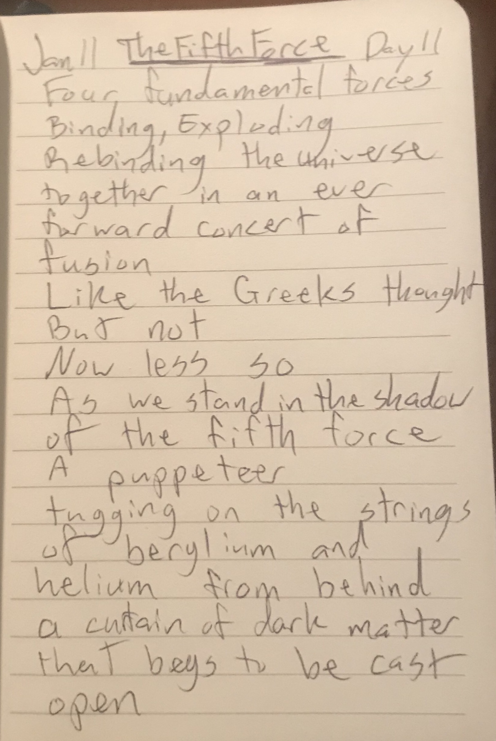 Today’s poem is brought to you courtesy of this futurism article. The short version, we’ve always thought that the universe has 4 fundamental forces that basically bind everything together: gravity, electromagnetism, and both strong and weak nuclear force. Now some scientists believe they may have discovered a fifth, one that more fully explains dark matter and deepens our understanding of how the universe really works. Pretty neat stuff!