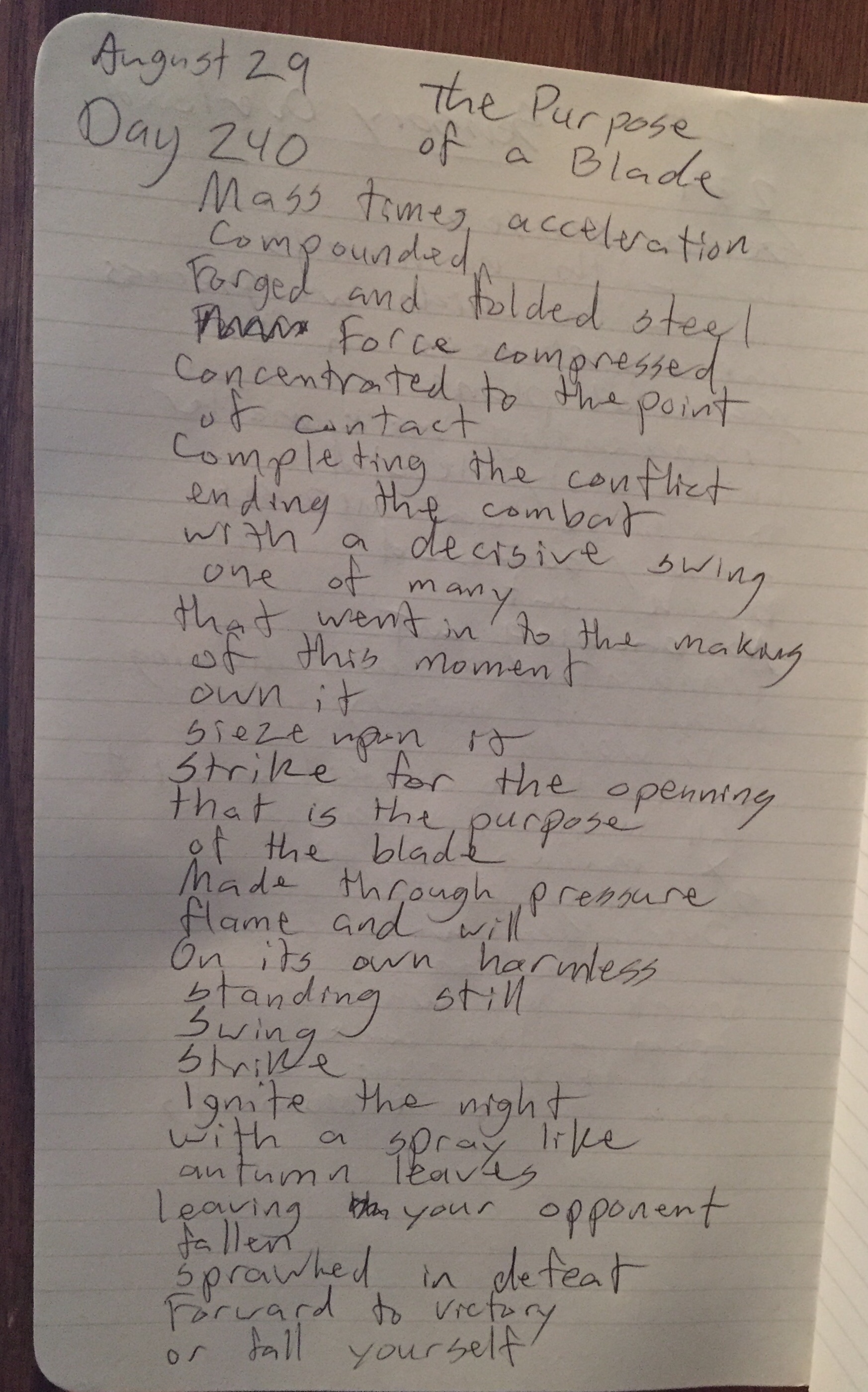 I had a conversation last night about the way we change. How sometimes we are not stretched but instead compressed. It made me think of swords, how they are forged, how they function, and what their purpose is. We as human beings are in a never ending war against entropy. Like swords, we must be forged to become strong enough to fight back, and also like swords, we are only dangerous when we are moving.