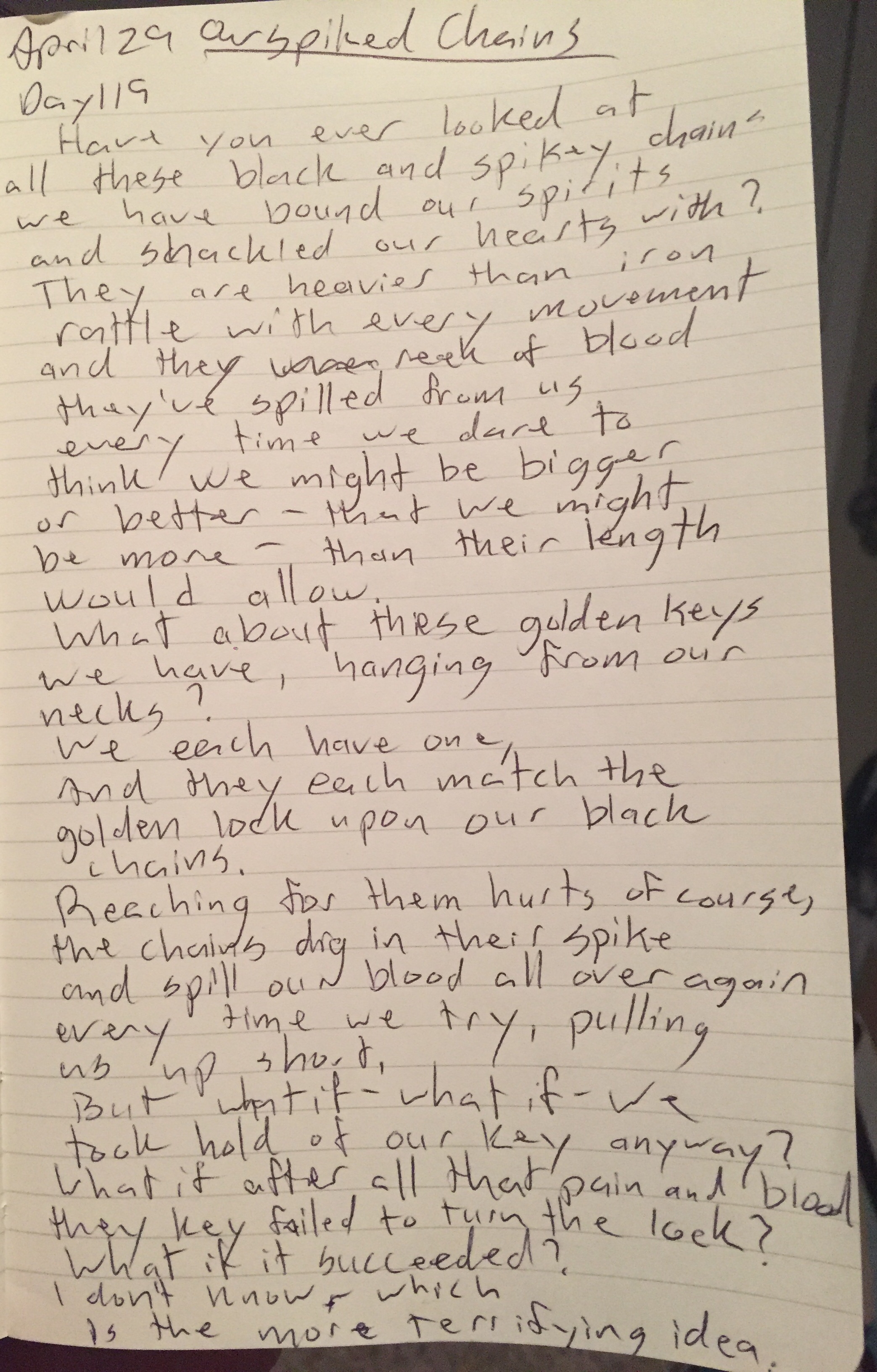 Thinking about the shackles we bind ourselves with, the damage their negativity does, and our deep rooted fear of daring to live without them.