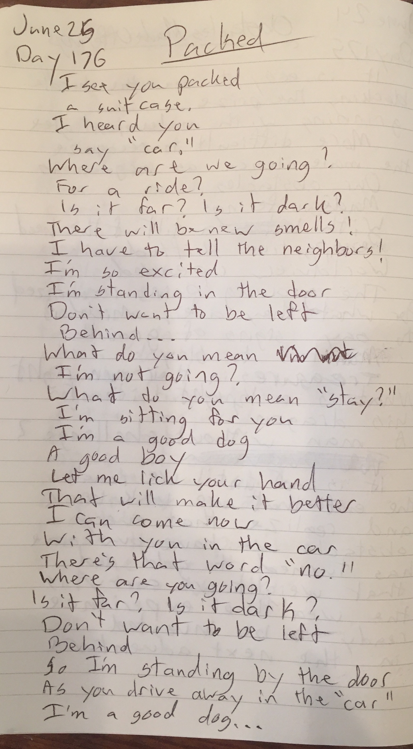 Yesterday I left my bride and my dog in Houston. Nobody’s especially thrilled about it, least of all my puppy. He’s a rescue and has severe anxiety attacks every time he sees a suitcase being packed. He knows it means a trip and that it’s not going to be a quick ride in the car. He gets both desperate and excited and it’s him that inspired yesterday’s poem. Kind of hurt to write it out. I’m missing him and my bride today.