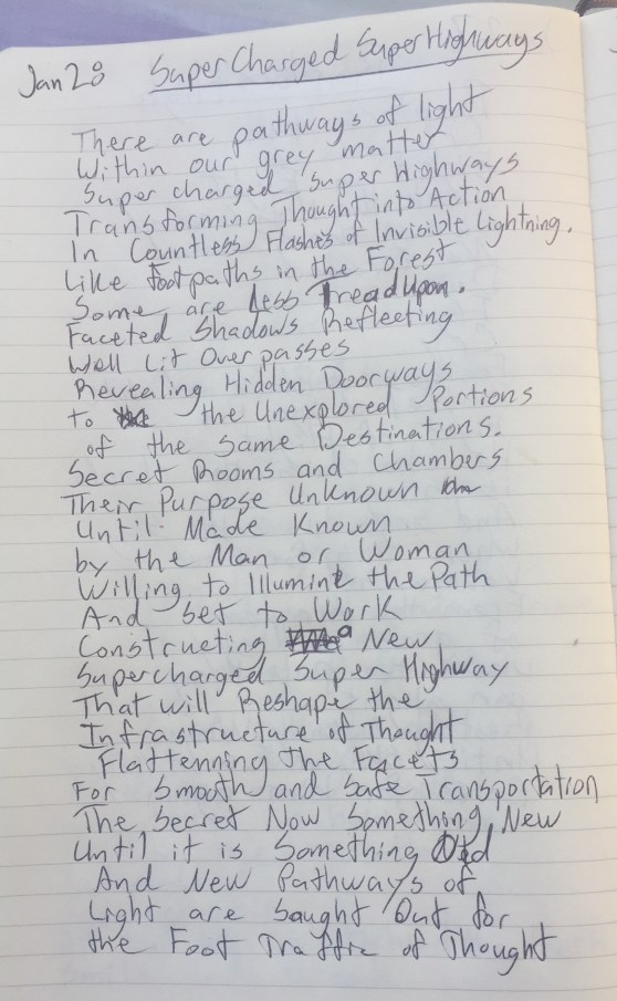 Had some interesting thoughts about the nature of thought, the transformation of thought into action, the process that undergoes, and how the way we choose to think, the thoughts that we focus on and allow ourselves to have, shape who we are and what we are capable of. While dwelling on this I reread Frost’s “The Road Not Taken” and the idea of thoughts following highways in our brains that we have constructed occurred to me. Hardly a new concept but it stuck with me and insisted upon being today’s subject.